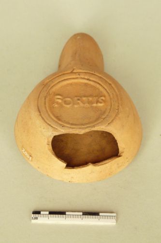 Lucerna frammentata a canale chiuso (tipo Buchi IXa) in argilla rosa arancio chiaro; disco non figurato, due borchiette sulla spalla e piccolo foro di aerazione nella zona centrale del canale. Il marchio è FORTIS.