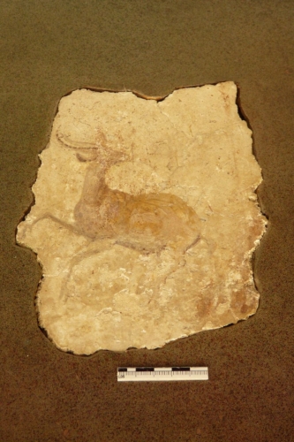 frammento a fondo bianco che presenta una figura di stambecco in corsa, retrospicente. La stesura pittorica è pittosto accurata come viene testimoniato dall'uso di sfumature di colore per rendere la volumetria del corpo. Non è possibile stabilire la collocazione originaria del frammento nello spazio parietale.