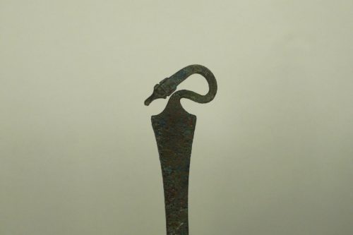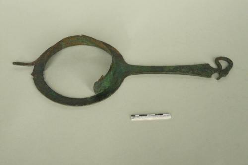attingitoio o colino con ampia tesa orizzontale, vasca emisferica, manico a nastro impostato sul labbro e sagomato, desinente con un elemento a collo d'anatra; sul lato opposto della vasca attacco di un possibile anello per la sospensione