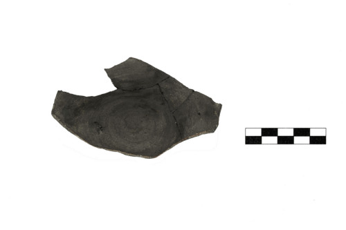 Scarto di produzione di coppetta con fondo discoidale. Sul fondo esterno, iscrizione graffita dopo la cottura con punta molto sottile, tratto regolare poco profondo, ductus sinistrorso, poco leggibile. L'argilla è di colore grigio scura.