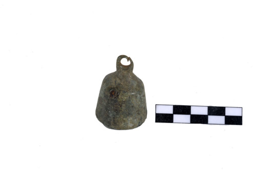 Tintinnabulum a campana con cupola conica, con base rotonda sprovvista dei peducci e con anello di sospensione a profilo circolare allinterno e ovale allesterno. Allinterno, tracce dellattacco del batacchio. La patina è di color verde scuro.