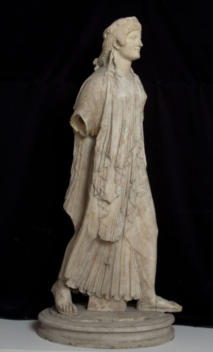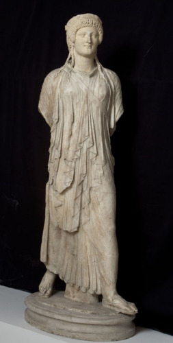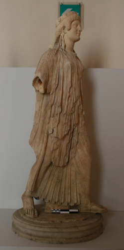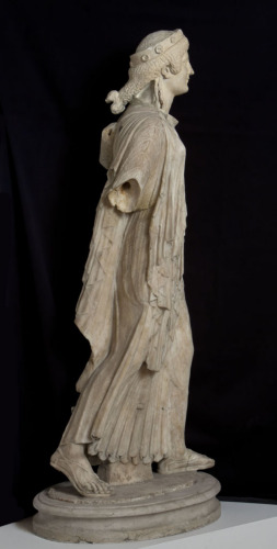 - NOTIZIE STORICO CRITICHE La statua, già presente nella raccolta Grimani, fu probabilmente restaurata nel XVI secolo con l'integrazione del piedistallo circolare su cui è impostata, del piede sinistro, del braccio destro e della testa; questultima fu sostituita agli inizi del Novecento con un calco in gesso ottenuto da un'analoga scultura conservata presso il Museo Nazionale di Napoli. Nella storia degli studi, il confronto della statuetta veneziana con l'esempio conservato presso il Museo Archeologico di Firenze, scoperto a Castiglione della Pescaia, oltre che con quello del Museo Nazionale di Napoli, proveniente da Pompei, ha dato adito a diverse interpretazioni: alcuni studiosi (F. Studniczka, L.M. Miliani) hanno proposto che la statuetta rappresenti la copia dellimmagine crisoelefantina di Artemide Laphria creata dagli scultori Menaichmos e Soidas nella prima metà del V sec. a.C., mentre altri lhanno identificata come replica di un originale bronzeo greco arcaico di ambito siceliota intorno allanno 500 a.C. (C. Anti, R. Herbig, B. Forlati Tamaro); altri ancora, infine, la reputano una creazione arcaizzante della metà del I sec. a.C. (G. Becatti, G. Lippold, G.M.A. Richter, M. Bieber, Harrison, B.S. Ridgway, Fuchs, E. Simon). Più convincente appare l'ipotesi di A. Giuliano, ripresa anche da G. Traversari, che riconosce in quest'opera una raffinata creazione dell'arte colta romana di orientamento arcaizzante, da ricondurre probabilmente alla scuola di Pasiteles. A suggerirlo sono soprattutto i particolari del panneggio che esprimono una vivacità decorativa di notevole finezza, in contrasto con il gioco di linee geometrizzanti e toni disegnativi della figura, impostata rigidamente secondo gli schemi ben noti delle Korai arcaiche, di cui riprende anche i motivi tipologico-formali della testa.