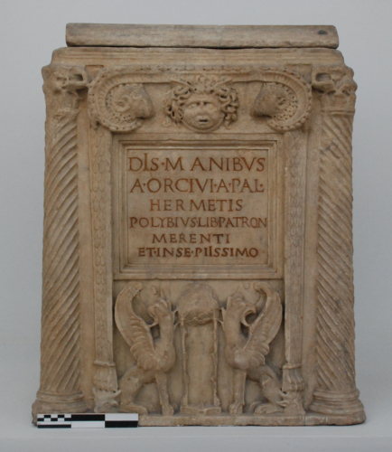 - NOTIZIE STORICO CRITICHE Nel Cinquecento l'ara si trovava nel giardino di Palazzo Grimani a Roma, dove fu vista dallo Smetius. Come indicato dall'iscrizione all'interno della tabula, l'ara è dedicata dal liberto Polybius al proprio patrono Aulus Orcivius Hermes, della tribù Palatina di Roma, con l'invocazione agli dei Mani per evitare eventuali profanazioni dell'altare, all'interno del quale erano effettivamente contenute le ceneri del defunto. Sul bordo superiore, due fori indicano il fissaggio delle grappe per la copertura, perduta e sostituita con una di età rinascimentale. Sul lato destro, invece, un foro circolare attesta il riutilizzo del manufatto, forse come fontanile.