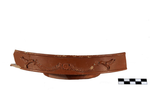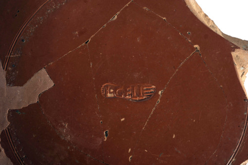 Piatto con orlo verticale a fascia semplice, leggermente convessa, e sottolineata, in alto e in basso, da un bordino a profilo arrotondato, piede ad anello troncoconico, smussato, piatto interno piano, decorato da tre cerchi concentrici incisi a linea doppia, i primi due, quelli più esterni, racchiudono una fascia decorata a rotella e riempita da un motivo inciso a trattini obliqui, fitti e paralleli, al centro del piatto, bollo in planta pedis d. su riga unica, lettere rilevate L (punto) GELL. L. Gellius è un vasaio, forse aretino, con probabile succursale anche a Lyon; la sua produzione si concentra nella Venetia, con nuclei consistenti in Latium, Etruria e Transpadana. La fascia dellorlo è decorata con un motivo ad applique: due ghirlande con rosetta centrale tenute con il becco, alle estremità, da due volatili. L'argilla è di colore camoscio rosato, la vernice è rosso-arancio. Il fondo del piede non è verniciato, la vernice è colata sulla parete, sulla quale è una impronta digitale.