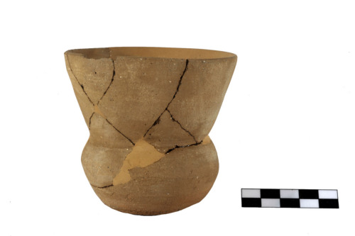 Bicchiere con alto orlo a pareti leggermente svasate, corpo globulare, fondo appena concavo. L'argilla è di colore giallo grigiastra, con macchie biancastre sulla superficie. Questo tipo di bicchiere fu prodotto, probabilmente, nella Valle del Po, e diffuso, principalmente, nella parte occidentale della pianura padana, ma presente anche in Italia centrale e centro-settentrionale. Molti esemplari provengono da Ornavasso e da Gabi.