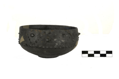 Coppetta con carena a circa metà della parete e al di sopra della carena le pareti si inclinano leggermente verso linterno, orlo indistinto e assottigliato, basso piede a disco con fondo leggermente concavo e verso l'attacco del piede, cerchi concentrici incisi. Parte superiore della parete esterna con decorazione a barbottina costituita da una fila di archi a bugnette appuntite chiusi in basso da un'altra fila orizzontale di identiche bugnette, mentre al centro degli archi e tra un arco e laltro sono bugne appuntite più grosse. Leggera sabbiatura sulla superficie esterna ed interna. L'argilla, granulosa, è di colore grigio ferro, la vernice o glanztonfilm è iridescente.