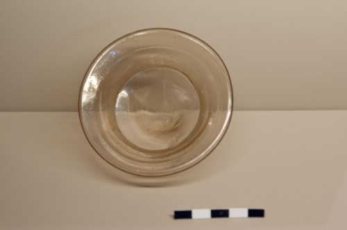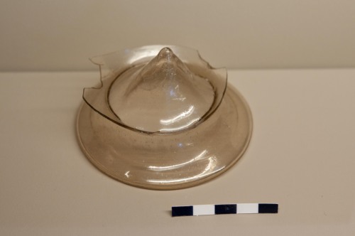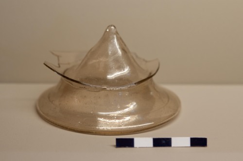 Base troncoconica di una bottiglia di vetro, di tipo angastaria o inghistera. Il frammento rappresenta la base conica allargata, del tipo a piedistallo, con il cono rientrante allinterno della bottiglia. Il corpo della bottiglia è globulare (o panciuto) e probabilmente aveva un lungo collo cilindrico. Il piede è ottenuto con una soffiatura a mano libera, spingendo allinterno del corpo il conoide che ne costituisce la base.