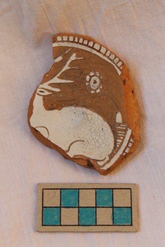 piatto o scodella di cui si conserva un basso piede ad anello sagomato, leggermente umbonato, con attacco di parete orizzontale. Il manufatto è ingobbiato, graffito e invetriato solo sulla superficie interna, mentre il rovescio è privo di rivestimento. Sul cavetto è raffigurata, entro un medaglione dentellato, una cerva, rivolta a sinistra, che presenta alle spalle un "hortus conclusus". Sulla sinistra si conserva una rosetta.