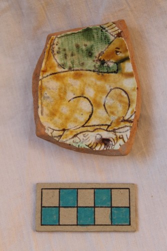 scodellina di cui si conserva il piede ad anello leggermente umbonato e l'attacco di parete a profilo emisferico. Il manufatto è ingobbiato, graffito e invetriato solo sulla superfie interna. Il rovescio è ingobbiato fino al piede tranne il fondino. Sul cavetto è presente un unicorno rivolto a destra, con capo girato a sinistra, racchiuso entro una cornice polilobata. Il corpo del quadrupede, accovacciato su foglie accartocciate, è campito da un reticolo di linee dipinte in giallo, mentre il fondo è dipinto in verde e rotellato.