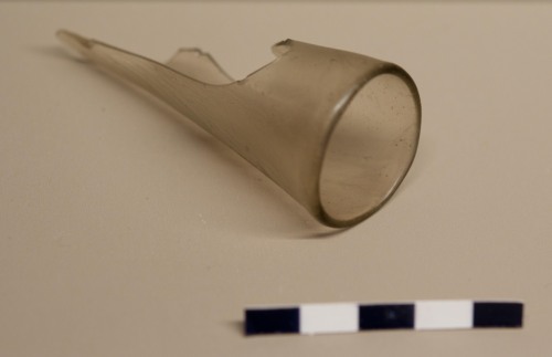 Collo tubolare di bottiglia, probabilmente di tipo globulare (con corpo panciuto) di colore trasparente. Il collo risulta perpendicolare rispetto al corpo.