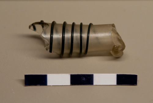 Frammento di un collo di bottiglia, con stretto collo cilindrico su ventre espanso (o globulare), con base probabilmente apoda o piede ad anello. Il vetro è trasparente. Il frammento non presenta il labbro, è rotto nel puntyo in cui la parte alta del collo è decorata da una morisa, ovvero da un nastro di pasta vitrea trasparente avvolto a spirale e pinzato in moda da creare un motivo a onde. Al di sotto della presenta una decorazione formata da un filamento di pasta vitrea di colore blu, applicata a caldo che avvolge il collo da una elegante spirale.