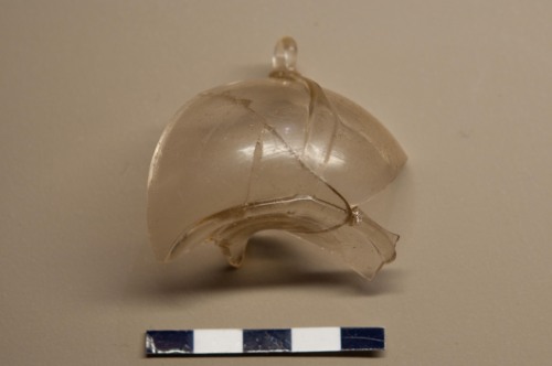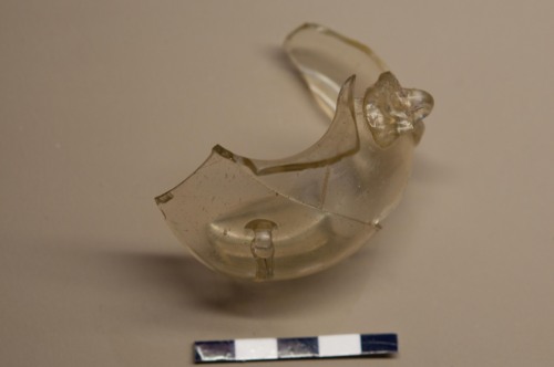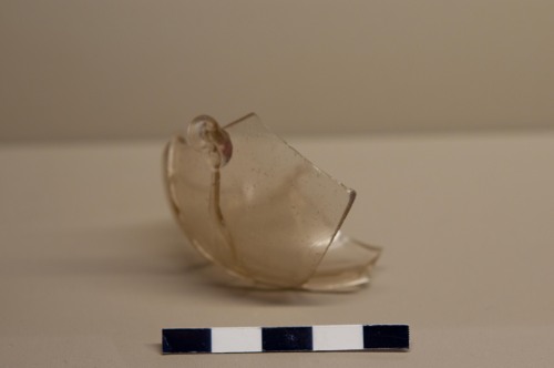 Frammento del corpo globulare di lampada pensile di tipo orientale o islamico, in vetro trasparente. Tale lampada si imposta su un piede troncoconico rientrante e si sviluppa con un corpo globulare leggermente schiacciato. La lampada terminava con un alto bordo troncoconico (non conservato in questo frammento). La lampada veniva sospesa per lilluminazione attraverso alcune catenelle o fili inserite nelle apposite ansette. Le anse da sospensione hanno in questa lampada la forma di gocce allungate e sono applicate nella parte più espansa del corpo globulare. Il combustibile utilizzato per lilluminazione era posto allinterno di un piccolo recipiente contenuto nella lampada, che di fatto non presenta tracce di bruciature.