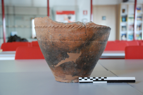 Contenitore a base piana e pareti svasate, con decorazione a cordoncino a rilievo, sottolineato da una solcatura parallela.