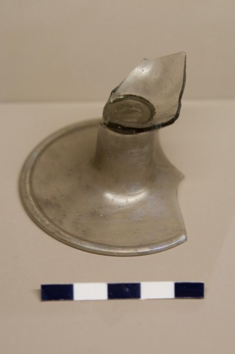 Base di calice a coppa conica, senza nodo, in vetro trasparente, con piede su anello leggermente estroflesso. La coppa si imposta sul direttamente piede, non conico.