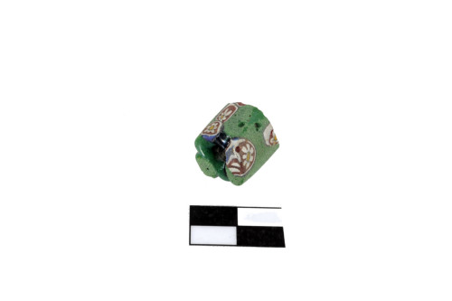 Vago di forma cilindrica allungata con foro passante orizzontale. Pasta vitrea verde e blu con decorazioni a chiazze e a fiore di colore bianco, rosso, verde e giallo.