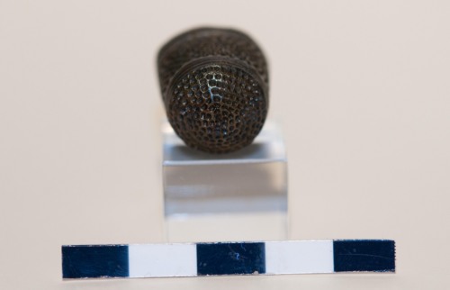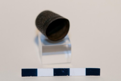 Ditale chiusa a cupola in lega di rame. Ditale a forma troncoconica decorato con 9 linee di punzonature a punti. Alla base vi sono tre linee incise continue, e le prime due chiudono una decorazione con piccole tacche punzonate. La parte alta è decorata con 3 linee incise e 9 cerchi concentrici si punti punzonati che coprono la calotta.