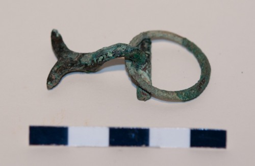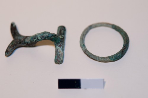 Gancio (gancetto) a staffa con anello per chiusura, da abbigliamento. Il gancio ha la forma di una staffa e presenta la parte finale sagomata a coda di rondine divaricata in modo da facilitarne la cucitura al tessuto. La parte che serviva per la chiusura è formata da un bastoncello metallico inserito sul gancetto. Il bastoncello veniva agganciato allanellino. Lanello è un semplice anello di filo di lega di rame a sezione circolare.