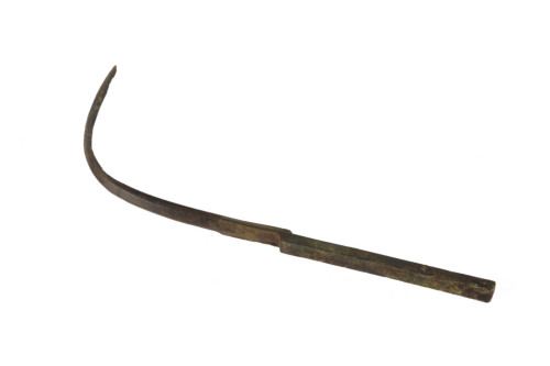 Strigile con capulus (manico) parallelepipedo, pieno, liscio, a sezione rettangolare con alette laterali aderenti ai margini della ligula (cucchiaio) e decorato da due linee incise, sui lati lunghi. La ligula presenta allinterno, nel punto di attacco con limpugnatura, una terminazione semicircolare prominente. Sulla faccia interna dellimpugnatura, vicino allattacco con la ligula, due bolli impressi a lati concavi a formare una T e con segni illeggibili all'interno di ciascun bollo, probabile marchio di fabbrica o di proprietà. La ligula è incurvata quasi ad angolo retto, terminante a punta e superiormente decorata da una costolatura centrale e da due leggere laterali. Patina di color marrone.