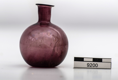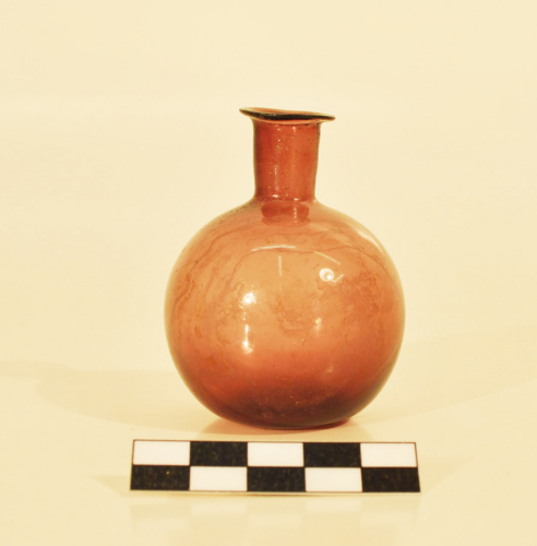 Balsamario con orlo estroflesso, labbro tagliato e arrotondato, breve collo cilindrico alto circa un quarto dellaltezza totale, sottolineato alla base da una strozzatura, corpo sferoidale, piccola base leggermente concava. Vetro di colore viola, trasparente. Diffuso in tutta Italia, ma frequente anche in Gallia e nelle province transalpine.