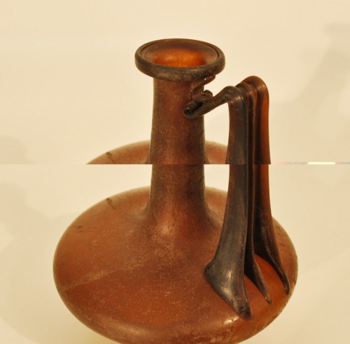 Brocca con orlo ribattuto a fascetta, lungo collo cilindrico rastremantesi verso lalto, ansa a tre nervature, piegata ad angolo acuto e saldata con ricciolo al collo, corpo a trottola, piede ad anello, piuttosto rigonfio, ricavato dalla base. Il tipo di brocca è diffuso in Italia nord-occidentale e in Francia, dove è documentata una produzione locale nellatelier di Lione dal secondo quarto del I sec. d.C.(cfr. Foy/Nenna 2001, cit., p. 187; Foy/Nenna 2003, cit., p. 241). In Veneto alcune esemplari, non molti, sono stati rinvenuti soprattutto a Montebelluna e ad Adria (cfr. Larese 2004, cit., p. 29, tab. 49, fig. 31). Vetro di colore giallo scuro, traslucido.