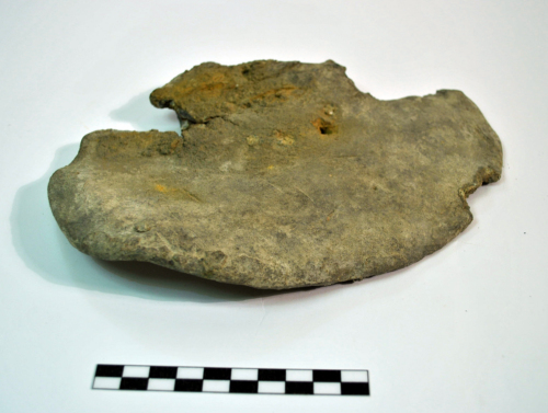 Frammento di grossa lamina in piombo con una parte semicircolare e bordo arrotondato, laltra irregolare e in parte ripiegata verso linterno.