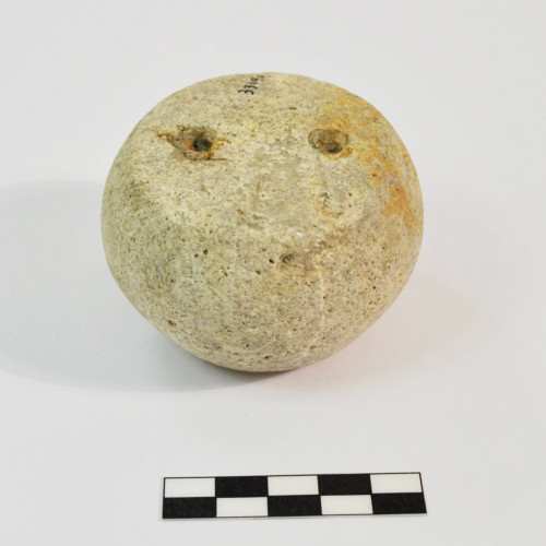 Peso in pietra grigiastra, probabilmente calcarea, di forma sferica decalottata, la superficie inferiore è leggermente concava, su quella superiore, piatta, vi sono due fori circolari allineati orizzontalmente, destinati a ricevere un manico in ferro di cui si conservano i grumi. Anche il manico contribuiva a determinare il peso nominale delloggetto. Vicino al peso di 1 libra = 327,45 gr.