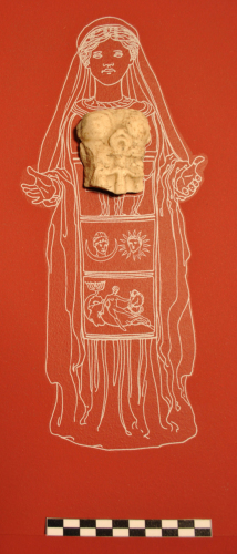 Scheggia di marmo con l'effigie a bassissimo rilievo di un busto femminile. Lungo la frattura superiore del frammento sono scolpite quattro piccole sfere pertinenti ad una collana, in basso due calotte circolari a protezione dei seni, tra le quali è un grande pendente a forma di crescente lunare appeso ad un nastro; al di sotto del pendente e del seno s. è parte di una cintura con solcatura mediana. Questa segna il margine superiore di un fascia nella quale sono scolpite le tre Grazie, conservate solo parzialmente. Marmo bianco a grana molto fine. Si tratta di una replica dell'Afrodite di Afrodisia in Caria raffigurante la dea stante con le braccia piegate e le mani tese in avanti. La figura risulta incorniciata da un velo lungo fino a terra, fermato sul capo da una corona turrita e serrato contro il corpo dai gomiti. Il corpo xoaniforme è coperto da un sottile chitone ed è avvolto da una rigida sopravveste, l'ependytes, sostenuta da una sorta di bretelle, che inizia al di sotto del seno e termina oltre le ginocchia, decorata da fasce orizzontali con figurazioni allegoriche che, nelle varie repliche, si ripetono sempre uguali con variazioni nei particoli e nell'ordine in cui sono disposte (cfr. Fleischer 1973, pp. 167-168, cit.). Secondo le tre tipologie delle fasce figurate, la nostra replica sembrerebbe appartenere al tipo C che presenta tre fasce con le raffigurazioni delle Tre Grazie nella prima fascia in alto, i busti di Selene e di Helios e l'Afrodite Pelagia a cavallo di un mostro marino (cfr. Noelke 1983, pp. 122-123, cit.). Le raffigurazioni dell'ependytes rappresentano allegorie cosmiche riferibili ai regni della natura, Cielo, Mare e Terra, sui quali la dea esercitava il suo potere. (cfr. Bonomi 1994, pp. 457-460 con bib., cit.)