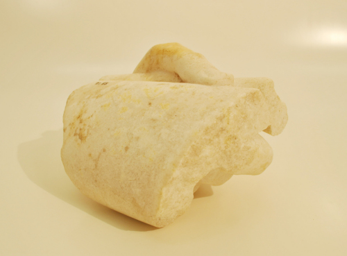 Grosso frammento di mano s. con anello con grande castone piatto, ovale allanulare, regge forse un volumen, il pollice e lindice stringono il bordo rotondo, il mignolo è piegato verso linterno. Polso non levigato, sbozzato, con foro centrale per alloggiamento della staffa. Marmo bianco a grana grossa.