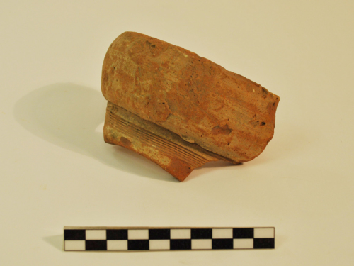 Orlo a fascia ingrossata e ripiegata all'esterno, marcato da un gradino; attacco del collo in espansione, sottolineato da cinque sottili costolature parallele. Tipo di anfora prodotta nella Tunisia centrale e settentrionale, diffuse lungo le coste del Tirreno, della Francia meridionale e del nord africa, adibite essenzialmente al trasporto di olio, diffuse dal II al IV sec. d.C. L'argilla è porosa di colore rosso scuro, ingobbio di colore biancastro.