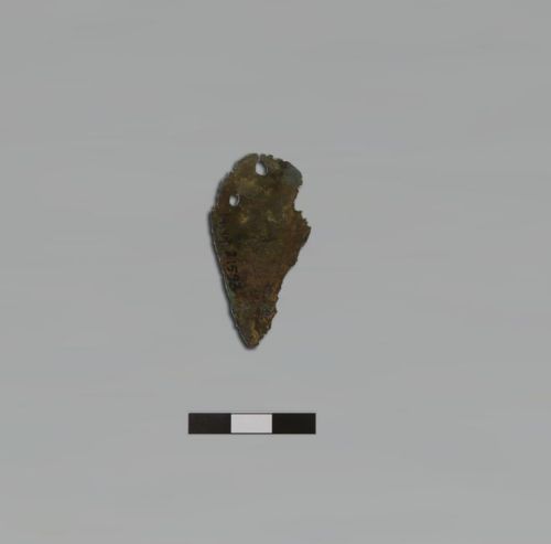 pugnale in bronzo, a base semplice a profilo arrotondato a tre fori , base in continuità con la lama, triangolare molto corta, a costolatura mediana poco accentuata e sezione romboidale