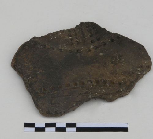 fondo piatto ombelicato con attacco di vasca, con decorazione cruciforme (?) a linee incise (tipo Barche di Solferino)