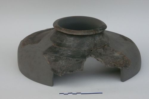 olla con imboccatura ristretta, orlo estroflesso, corpo schiacciato decorato sul punto di massima espansione da motivo complesso a reticolo ('gioco del tris') e cerchi incisi
