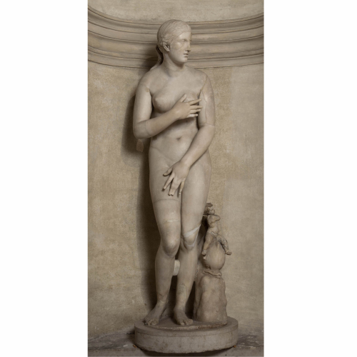 La scultura ritrae una figura femminile stante, il cui peso poggia sulla gamba sinistra, che anche appoggiata ad sostegno laterale. La gamba destra è delicatamente flessa e apre il piede verso l'esterno della figura. La figura è però piegata su stessa nell'atto di coprirsi pudicamente il seno e il basso ventre: infatti le braccia sono ripiegate verso l'interno, la destra è portata al petto, la sinistra si stende fino ad appoggiare la mano aperta sulla coscia e sopra l'inguine. La testa si volge decisa a sinistra: il viso, dall'ovale morbido e pieno, è caratterizzato da una fronte ampia, da piccoli occhi a mandorla, appena velati dalle palpebre superiori, il naso, in parte ricostruito, è diritto, la bocca ha labbra carnose, socchiuse in un'espressione di stupore. I capelli sono partiti da una scriminatura centrale e raccolti sul retro in una morbida coda. A lato della figura si trova, sopra il pilastrino, un bambino alato, dalla folta chioma riccioluta a cavallo di un delfino.