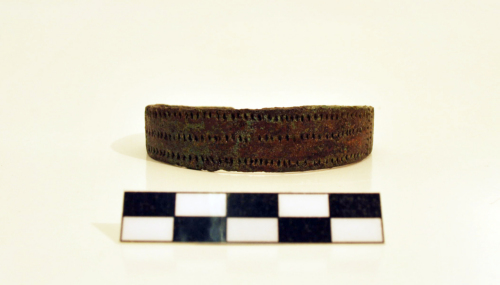 Armilla di forma ovale, verga ampia e piatta, a sezione rettangolare con capi aperti, estremità ingossate, appuntite e di forma trapezoidale sulle quali è incisa una X e una linea orizzontale. La verga è decorata superiormente, nella parte centrale, con tre file orizzontali e parallele di trattini incisi, paralleli e verticali, terminante su un lato con due file verticali e parallele di trattini incisi trasversali e paralleli, mentre sulle due parti laterali sono tratti incisi trasversalmente. Confronti per questo tipo di monile, variante della famiglia delle armille a testa di serpe, sono stati rinvenuti in Trentino Alto Adige, nel Veneto, nel Friuli, in Austria, in Ungheria e in Baviera. Veniva indossato da donne di costume tardo romano e rinvenuto nelle tombe. Patina di colore marrone.