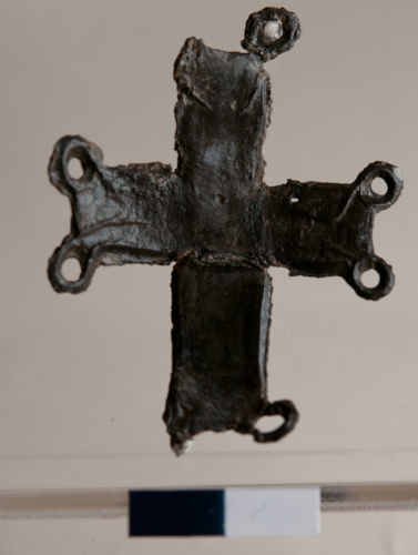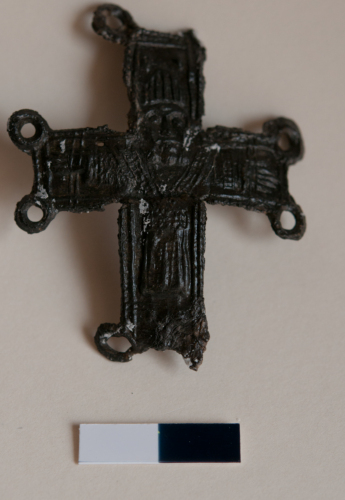 Insegna di Pellegrino a forma di Signum Crucis. Croce latina, decorata a sblazo con doppia cornice esterna. Il bordo più esterno è segnato da punzonature, mentre quello interno è liscio. In alto sono presenti due borchiette che incornicaino la testa di Cristo. Il Cristo è rappresentato in croce, a braccia distese. Vi è particolare cura nella resa del volto e delle mani, mentre è corsiva e semplificata la rappresentato del corpo, vestito in abiti vescovili e/o talari. Il volto presenta zigomi sporgenti e folta barba. La testa è decorata da una tiara. Le mani sono ottenute distese (di piatto), disegnando le cinque dita aperte. Labito è decorato da bordature lungo i polsi e lungo le gambe. Il collo è incorniciato da una decorazione a V che raggiunge la parta bassa del petto. Ogni braccio della croce era provvisto di due occhielli per il fissaggio alla stoffa. Due occhielli sono andati perduti e ne rimangono solo 6.