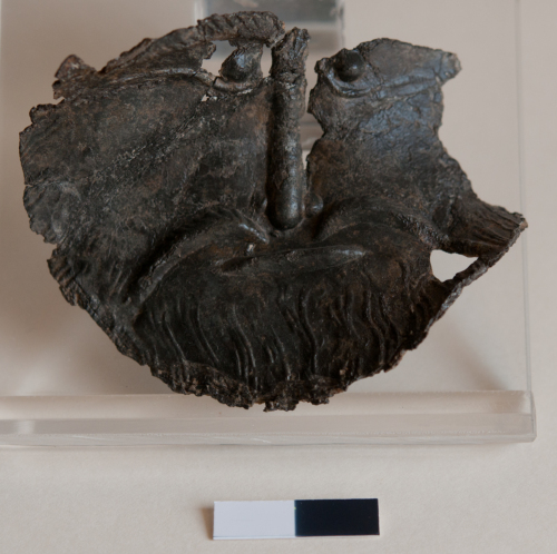 Parte di insegna da pellegrino con una decorazione antropomorfa con testa di uomo barbuto ricavata su tutta la superficie della circonferenza di una placchetta circolare. I baffi, il naso e la barba sono ottenuti a rilievo con cavetti saldati e decorati. Gli occhi sono resi condue umboncini a rilievo. Ciglia e barba segnati da deboli incisioni. Probabilmente rappresenta la testa di un santo.