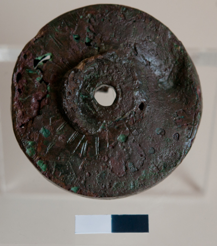 Elemento cavo a disco in lega di rame con lavorazione simile alle lucerne metalliche, interpretabile come portacandele o elemento orizzontale di un candelabro. Si tratta di due dischi saldati insieme ad una fettuccia che fa da bordo. Linterno è cavo. Lelemento doveva essere montato su di una struttura verticale, probabilmente metallica, ammorsata nel foro passante. In un lato è presente lattacco di un cilindretto di metallo che ha un diametro 81,8 cm9 compatibile con lalloggio di una candela. E presente una decorazione con segni incisi a raggiera su entrambi i dischi.