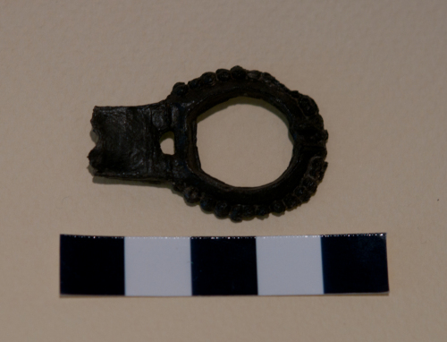 Fibbia da calzatura o borse, di piccole dimensioni in lega di rame. Fibbia di forma ovale su placca unita intera con i bordi smussati. Manca il perbo di chiusura. Si conserva la cornice ovale con il bordo decorato da punzonature e ovuli. La placca aveva almeno un foro per il fissaggio al cinturino.