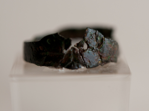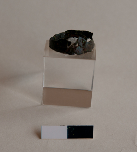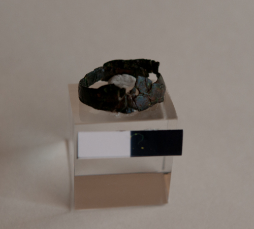 Anello a fascetta in bronzo, formato da ununica sottile fascia ripiegata e saldata sul retro. La parte centrale sagomata a rombo con decorazione incisa. La decorazione, rovinata da una spaccatura non è completamente leggibile, ma dovrebbe prevedere una croce, con un petalo nella parte bassa, e una punzonatura circolare in alto a sinistra. Si registrano Rotture recenti, probabilmente dovute d un restauro un po pesante, o ad una desalinizzazione non effettuata. Loggetto oggi è estremamente fragile.