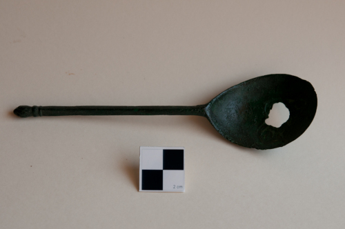 Cucchiaio in lega di rame, con manico a sezione quadrata, decorato da una pigna finale nellimmanicatura, preceduta da un doppio anellino.