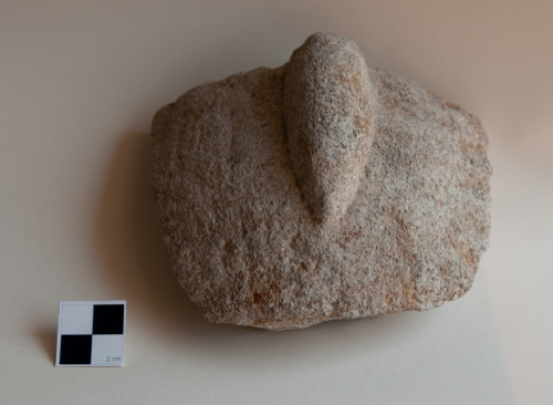 Frammento di mortaio di piccole dimensioni, di tipo domestico, in pietra di calcare bianca a vasca emisferica , con presa laterale a forma pseudo-ovale. Superficie interna molto lisciata.