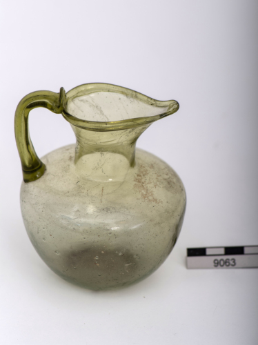 Brocca con orlo estroflesso a imbuto, con labbro ripiegato a cordoncino e beccuccio tirato a pinza, breve collo cilindrico, ansa a bastoncello a sezione ovale ricurva e con fermadito sull'orlo, corpo sferoidale schiacciato, base piana. Vetro gialloverde, trasparente.