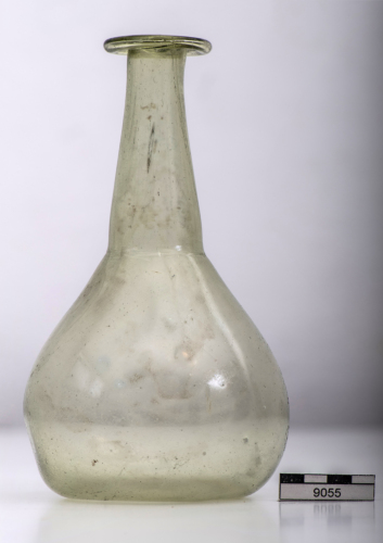 Grande balsamario con ampio orlo orizzontale ribattuto, lungo collo a profilo troncoconico, sottolineato da una strozzatura alla base, corpo piriforme espanso e arrotondato, base concava. Vetro giallo verdastro, trasparente.