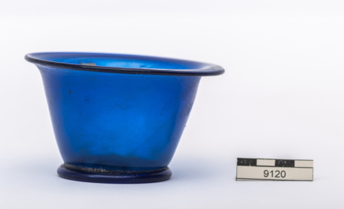 Coppa con orlo estroflesso e labbro arrotondato, corpo troncoconico, base con piede ad anello, concava all'interno, con traccia di pontello. Vetro blu trasparente.