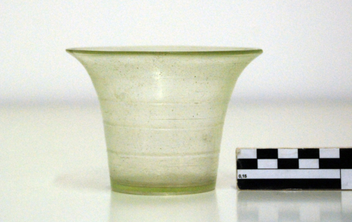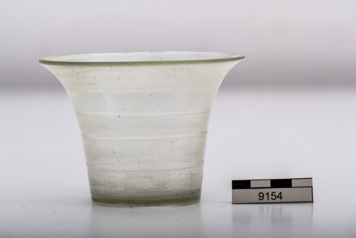 Bicchiere con ampio orlo estroflesso, labbro arrotondato e con un sottile solco a mola all'interno, corpo troncoconico e base piana con piede ad anello bassissimo e cerchiello umbonato centrale; sul corpo, quattro lievi costolature orizzontali a rilievo, ottenute levigando meccanicamente la superficie attorno. Vetro incolore con sfumatura verde, trasparente.