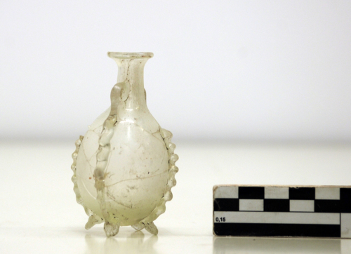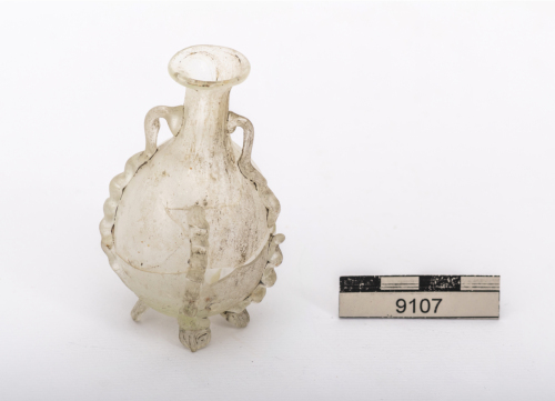 Amphoriskos con orlo estroflesso e labbro ripiegato all'interno, breve collo cilindrico e corpo ovoidale; due piccole anse a bastoncello verticali sono impostate sul collo e saldate alla spalla con una lunga terminazione a nastro pinzettato che scende lungo il ventre fino a formare due piedini sotto il fondo, altri due nastri pinzettati seguono il profilo del corpo dalla spalla al fondo formando altri due piedini. Vetro decolorato, trasparente.