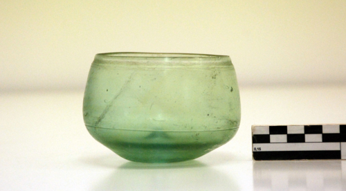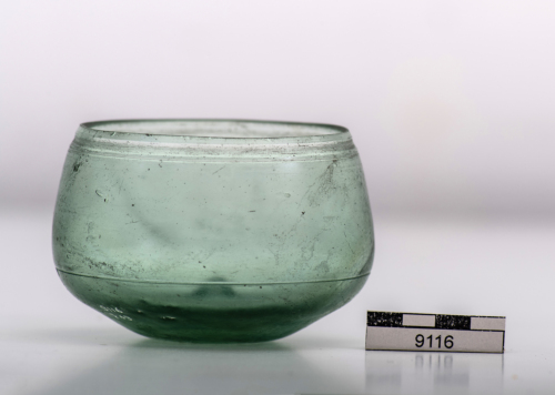 Coppa con orlo leggermente rientrante con labbro tagliato e levigato, vasca con bassa carenatura arrotondata, fondo con cono pronunciato; una fascia e un solco sottile a mola all'esterno dell'orlo e una linea sottile nel punto di massima espansione della vasca. Vetro verdeazzurro chiaro, trasparente.