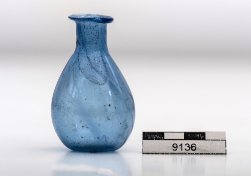 Balsamario con orlo estroflesso, labbro tagliato e arrotondato, breve collo cilindrico sottolineato alla base da una strozzatura, corpo piriforme allungato e base leggermente concava. Vetro blu trasparente.