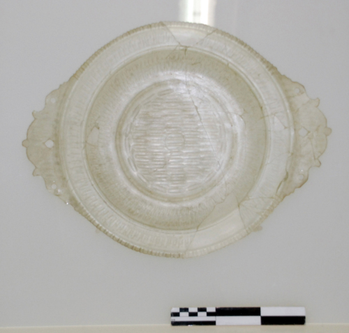Piatto circolare con orlo a tesa con bordo intagliato, con due anse orizzontali 'a delfino' traforate, vasca a pareti convesse e piede ad anello dentellato; l'intera superficie esterna è decorata a sfacettature ovali eseguite a mola. Vetro decolorato trasparente.