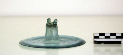 Coperchio con orlo tagliato e arrotondato, con profilo piatto e presa cilindrica con terminazione biforcuta.